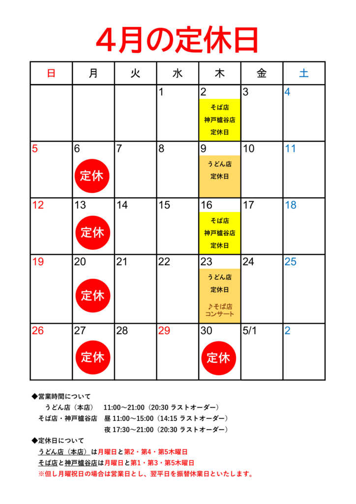 4月の営業日・定休日をご案内いたします。